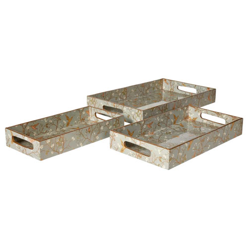 Brett i MDF med pent mønster av fugler og grener. Flott grå og gull fargemix. Perfekt til dekorasjon.