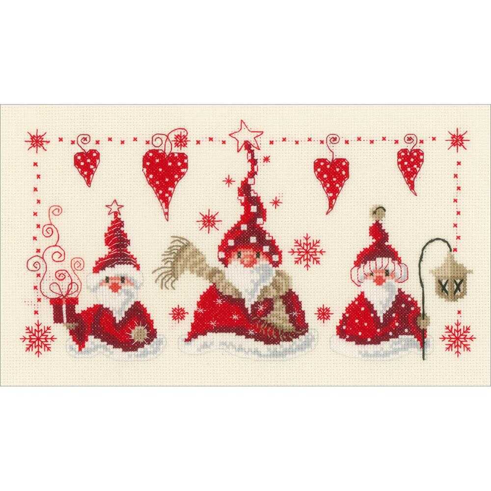 Vervaco-Cheerful Santas On Aida Counted Cross Stitch Kit. Vervaco creates magnificent designs in classical and modern styles ideal for both beginners and experts alike! Many designs originate fro m renowned contemporary artists. This package contains 14 count 100% cotton Aida fabric, 100% cotton DMC embroidery floss, one needle, and instructions. Finished Size: 6-4/5×11-3/5 inches.