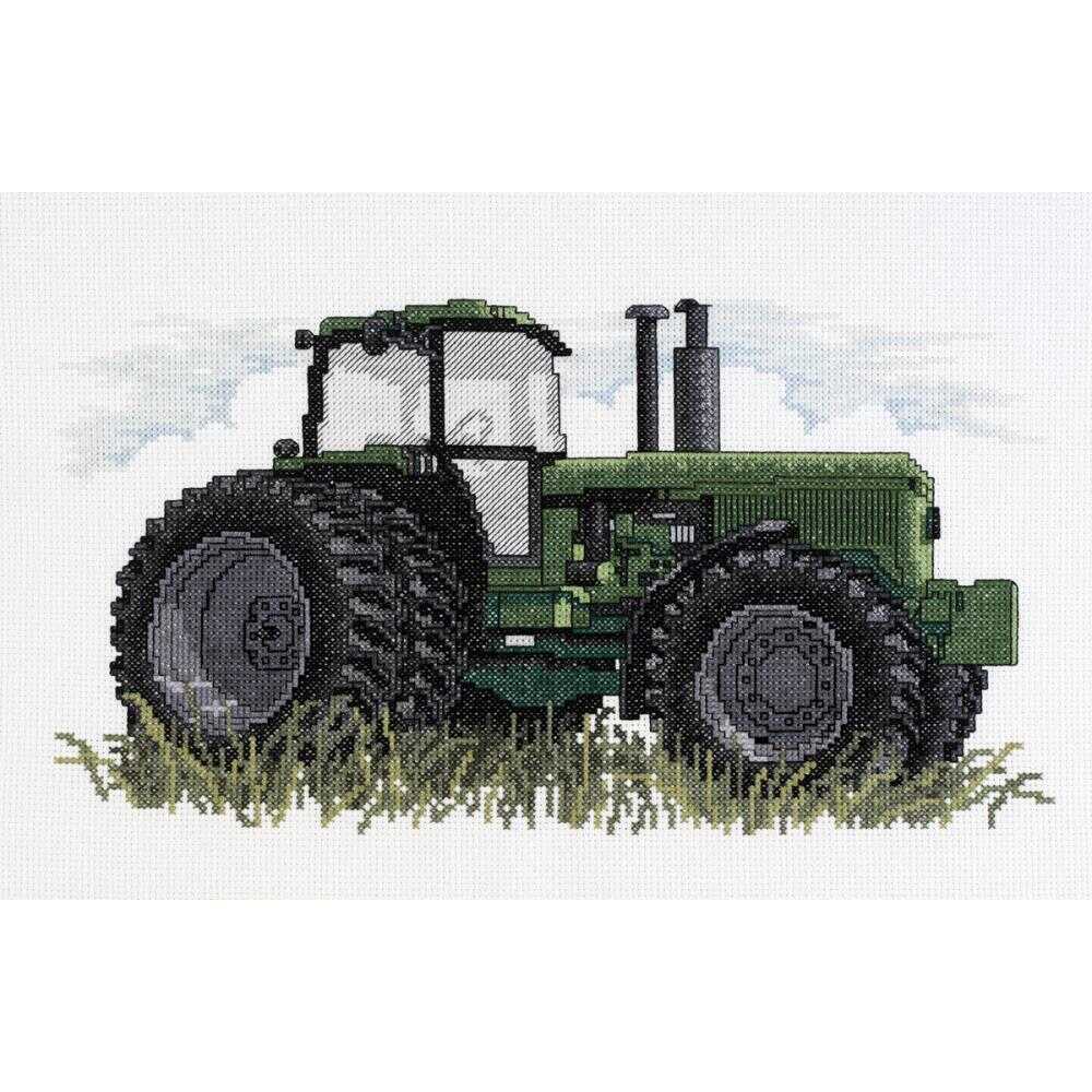 Ferdig bilde caThis kit contains 14 count white cotton Aida, cotton six-strand floss, floss cards, needle, graph and instructions. Finished size: ca 18×30 cm. Design: Tractor Designer: Stoney Creek.