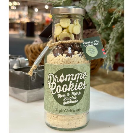 Herlige gaveflasker med hjemmelagd cookie mix fra Fryda gårdsbakeri. Med hvit og mørk belgisk sjokolade. Passer som gaver til de fleste anledninger.