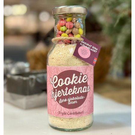 Herlige gaveflasker med hjemmelagd cookie mix fra Fryda gårdsbakeri. Med sprø sjokoladelinser. Passer som gaver til de fleste anledninger.