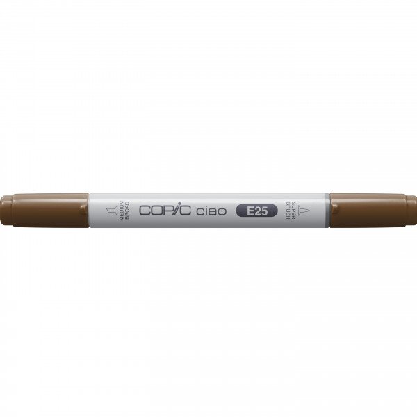 Copic Ciao er tilgjengelig i 180 farger, den er sylinderformet og har pensel (brush)– og cheasel (medium broad) tupp. Alkoholbasert og ikke giftig.
