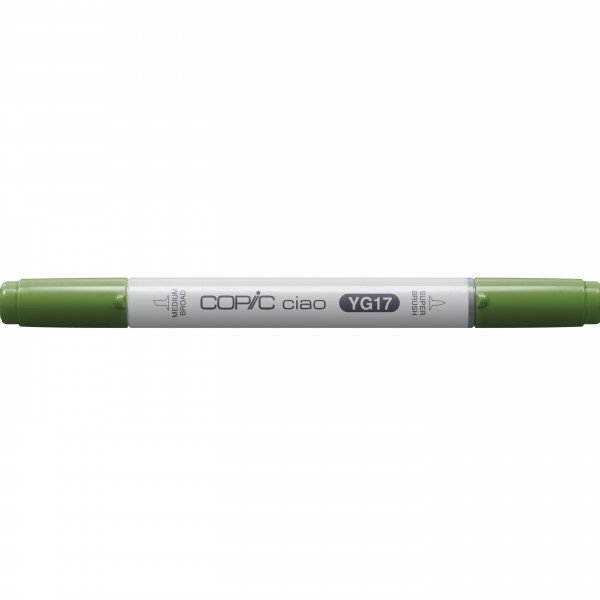 Copic Ciao er tilgjengelig i 180 farger, den er sylinderformet og har pensel (brush)– og cheasel (medium broad) tupp. Alkoholbasert og ikke giftig.