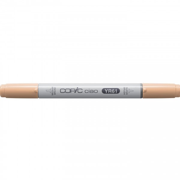 Copic Ciao er tilgjengelig i 180 farger, den er sylinderformet og har pensel (brush)– og cheasel (medium broad) tupp. Alkoholbasert og ikke giftig.