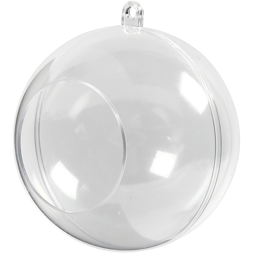 Todelt dekorasjonskule av klar, glatt plast, som kan samles til en kule med hullrom og hull foran og brukes som oppheng. Kan brukes til utstilling av diverse mini-installasjoner. Hullet er 4,5 cm i diameter.