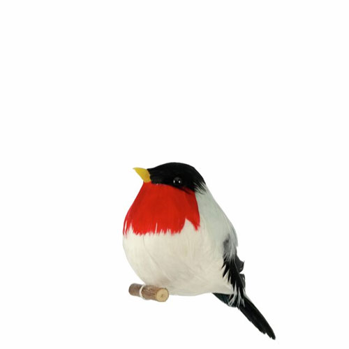 dompapp i fjær, sitter på pinne, med ståltråd til å surre fast i feks kranser
