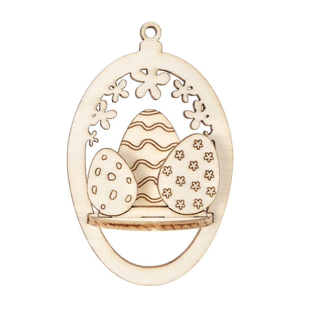 Dekorative påskeegg i tre med utskårne motiver som harer, kyllinger, blomster, sommerfugler og mønstrede egg. Perfekte til oppheng, borddekor eller kreative påskeprosjekter. Kan males, dekoreres eller beholdes i naturlig treutførelse.