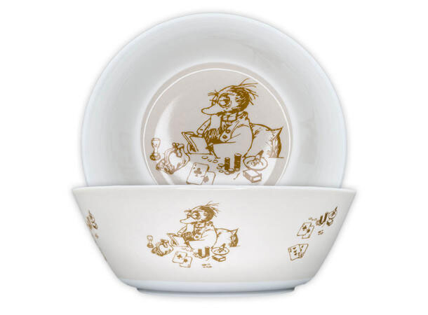 Flåklypa porselenbolle 14cm med motiv av Solan spiller poker. Den er laget til alle Flåklypa-fans som ønsker å ta med seg Flåklypa historien inn i hverdagen, enten det er til frokostbordet eller kveldsmaten.