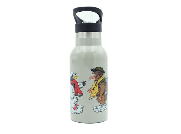 En hendig og fin drikkeflaske av rustfritt stål med motiv av det populære designet «Samtalen» med Solan og Ludvig som holder godt på kalde drikker.