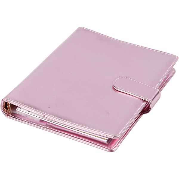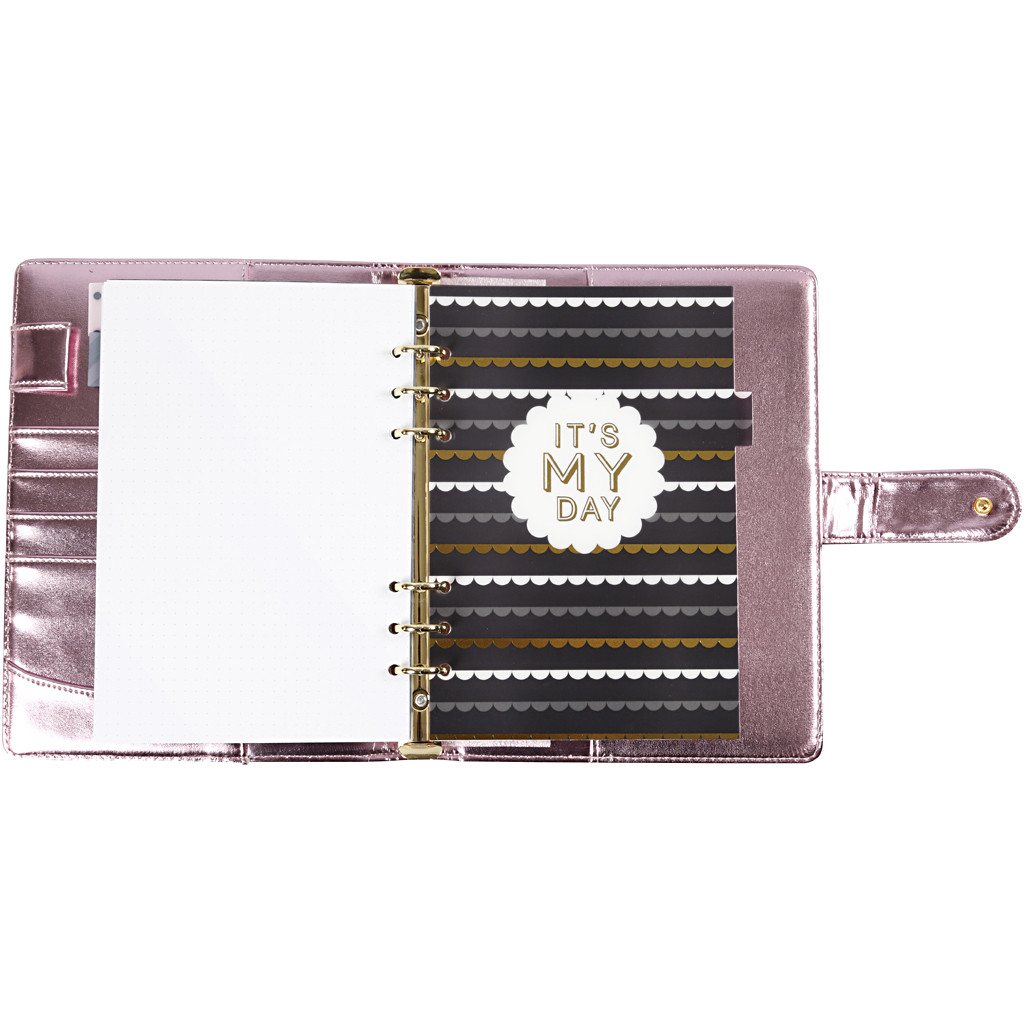 Kalenderomsalg i flott kunstlær med trykk- knapp lukking og ringordner (6 ringer) til f.eks. bullet-, reise- og creative journal. Inkl.sider til notater, sider med prikker (dots) og 5-ukers/måneds kalender.