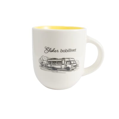 Kopp i keramikk med norsk tekst og motiv. Elsker bobillivet.