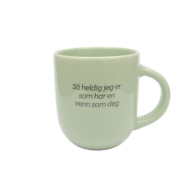 Kopp i keramikk med norsk tekst og motiv. Så heldig jeg er som har en venn som deg.