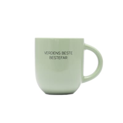 Kopp i keramikk med norsk tekst og motiv fra Lea.