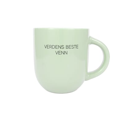 Kopp i keramikk med norsk tekst og motiv