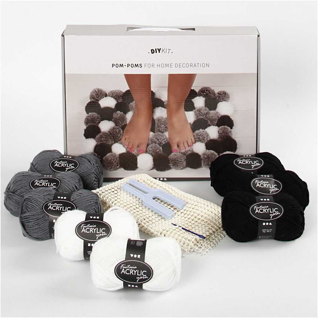 Inneholder: 8 nøster akrylgarn i 3 farger, ryastoff (50 cm x 50 cm), 1 pomponverktøy og 1 nål .