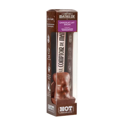 Melkesjokolade på en treskje, dekorert med en sjokoladebelagt bamse av marshmallow.
