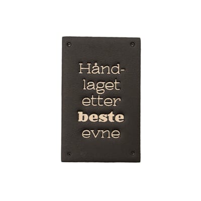 Symerke i imitert skinn med ferdig utstanset hull til montering. Disse er litt puffy og teksten er nedsunket. Håndlaget etter beste evne.