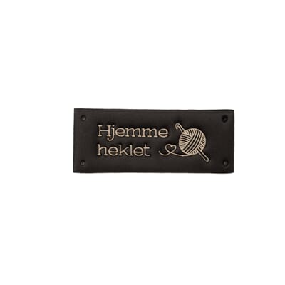 Symerke i imitert skinn med ferdig utstanset hull til montering. Disse er litt puffy og teksten er nedsunket. Hjemmeheklet.