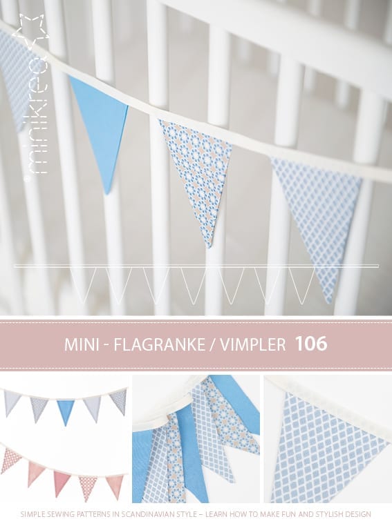 Flot dekorativ guirlande med vimpler. Nem at sy og perfekt som en sød enkel gaveidé, festdekoration eller pynt til børneværelset. Guirlanden kan syes i flere størrelser der alle i denne opskrift har 7 flag/vimpler i 3 forskellige farvenuancer.