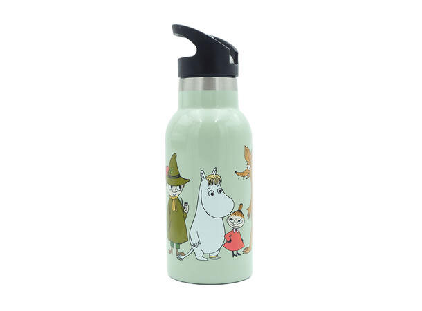 En hendig og fin drikkeflaske av rustfritt stål med motiv av Mummifamilien som holder godt på kalde drikker.