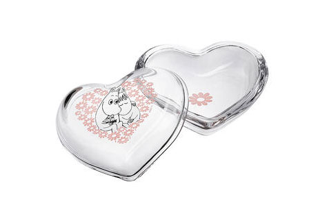 Hjerteformet glasskrukke eller skål med lokk. Kommer i gaveeske.