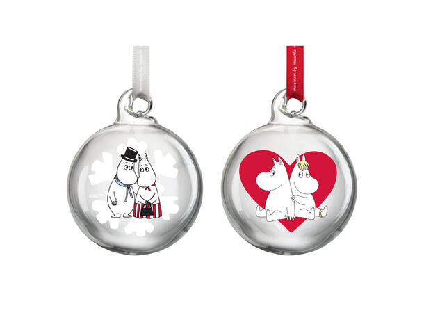 Mummi julekuler i eske med 2 ulike motiv fra Mummiverden. Kommer i eske a 2 stk. Julekulene er 5cm.
