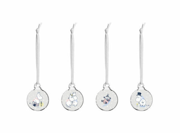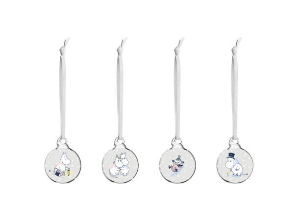 Mummi julekuler i eske med fire ulike motiv fra Mummiverden.