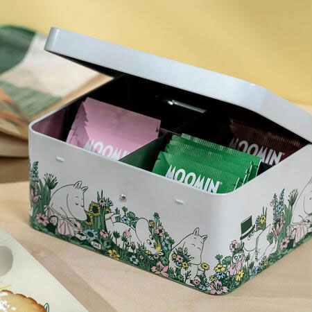 Teboks i tinn med Mummi-motiv og lufttett lokk. Passer perfekt til teposer eller te i løsvekt. Håndvask og grundig tørking anbefales.
