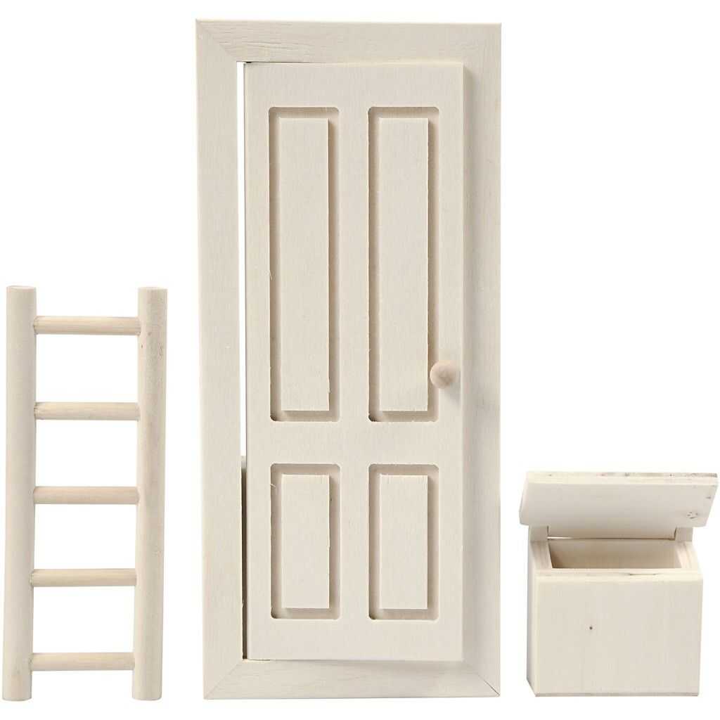 Detaljerte treemner som består av høyrehengt fyllingsdør med kulehåndtak og en postkasse med lokk, som begge kan åpnes og lukkes. Stige er også med.