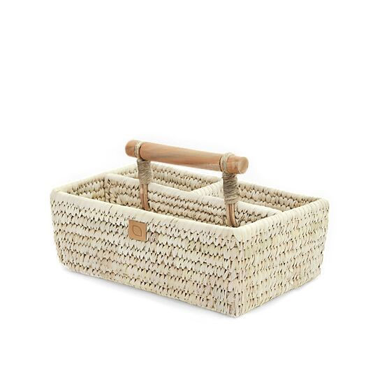 Kurven har håndtak i tre opphøyd i midten og to rom for å organisere vaskemidler, såper kluter og svamper.