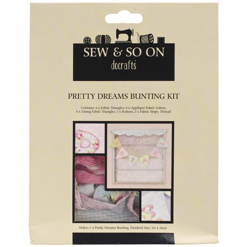 DOCRAFTS-Sew & Sew On Bunting Kit. A fun and easy way to create a beautiful bunting decoration! This package contains six fabric triangles, six applique fabric letter pieces, six lining fabric triangles, seven buttons, two fabric strips and thread to make one Pretty Dreams bunting. Finished size: 7×45-1/4 inches