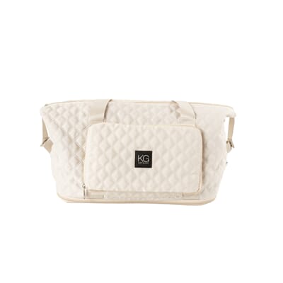 Stor veske i glatt stoff med håndtak. og ekstra lommer utvendig og innvendig. Med bunn som kan utvides, slik at du får enda større veske. Fin til å ha større strikkeprosjekt i.