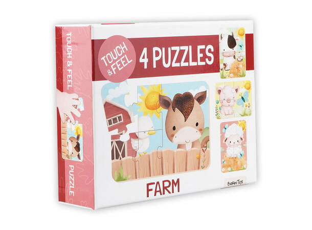 Gårdsberørings- og følelsespuslespillsettet tilbyr en morsom og interaktiv måte å utforske gårdsdyrenes verden gjennom lek. Dette settet inneholder fire vakkert illustrerte puslespill, hvert med et søtt gårdsdyr med teksturerte elementer designet for å aktivere berøringssansen.