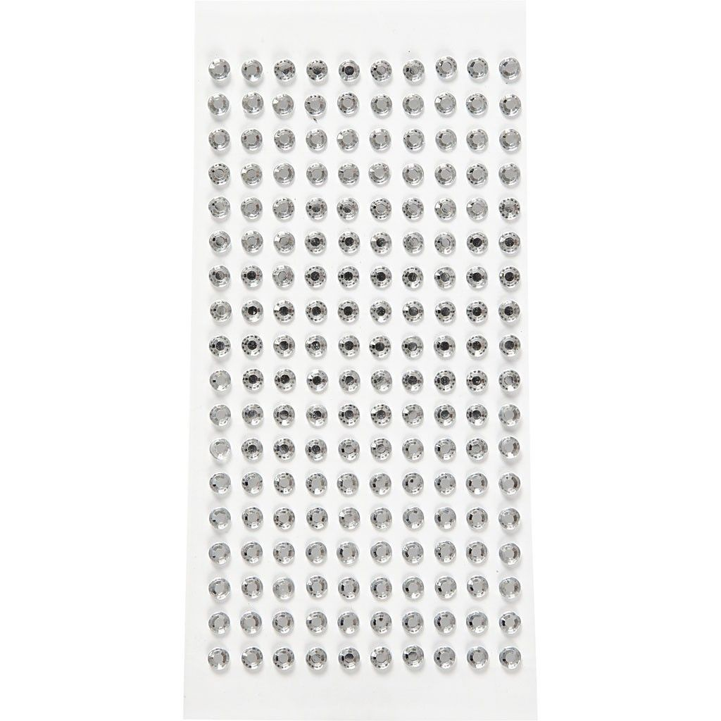 Selvklebende, runde rhinsten med facettslipt front og flat bakside.