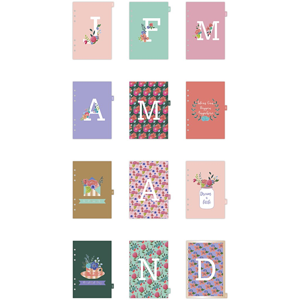 Dekorative skilleark med print av kraftig kartong med 6 hull til oppdeling av 12 måneder til .eks. planner, bullet-, reise og creativ journal aktiviteten. Skillearkene passer til kalenderomslag 192650 og 192651.