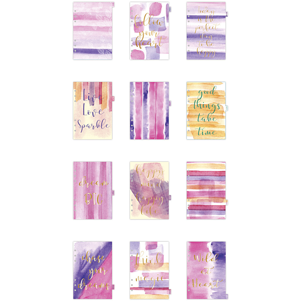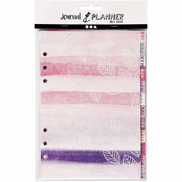 Dekorative skilleark med print i karftig kartong med 6 hull til oppdeling av 12 måneder til f.eks. planner, bullet-, reise- og creativ journal aktivitete. Skillearkene passer til kalenderomsalget 192650 og 192651.