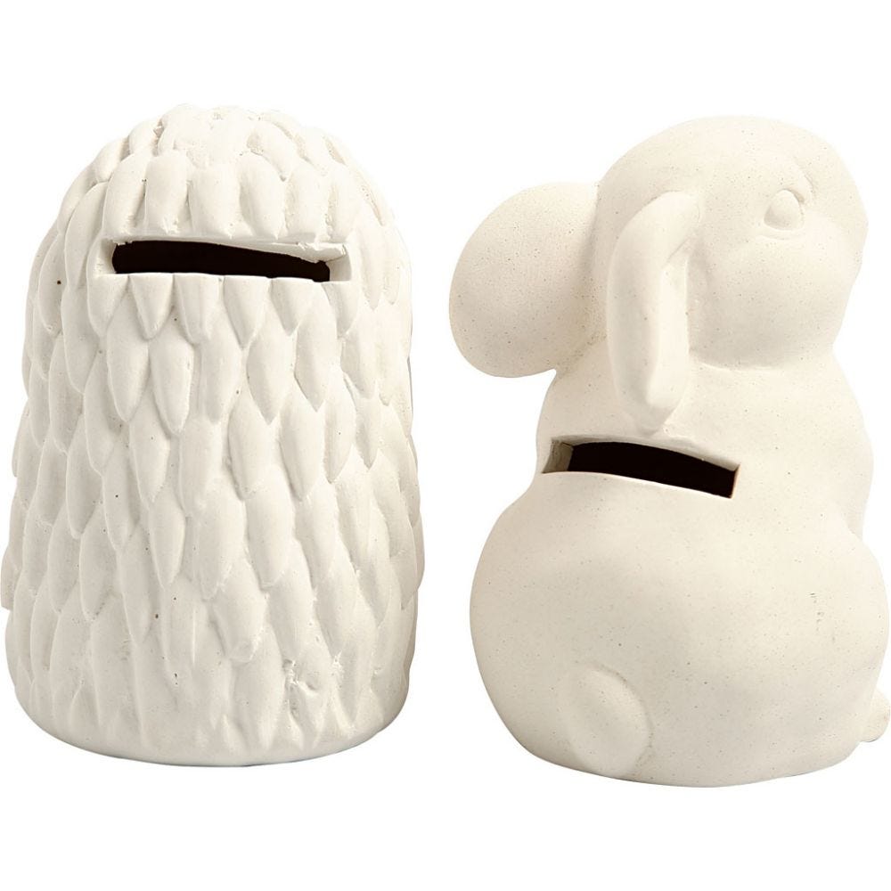 Sparedyr av ubehandlet terrakotta med gummipropp i bunnen. Kan dekoreres med f.eks. hobbymaling