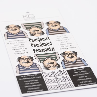 «Tekster og motiv på matt 200g kartong, selvklebende på brett. Syrefritt. Pensjonist, fantastisk, favoritt, gratulerer, lykke, kos, ung, endelig, flotteste.»