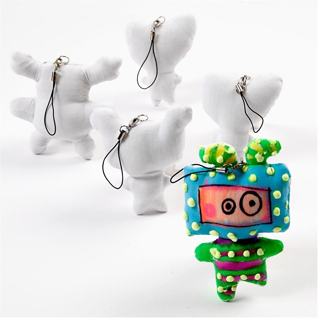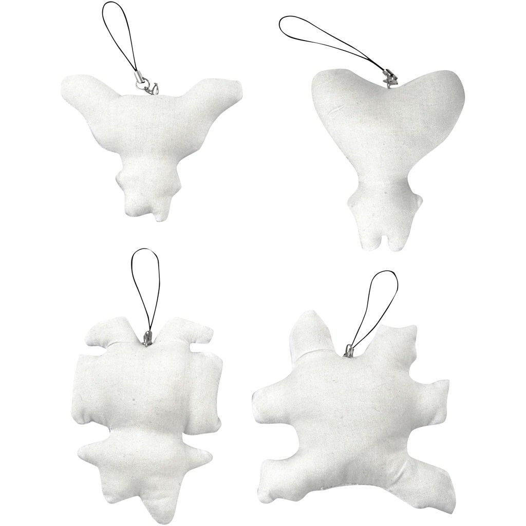 Ferdigsydde fantasifigurer av 100 % bomull. Pk. med 4 design, alle har opphengssnor.