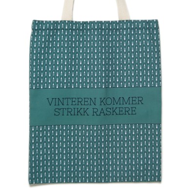 Veske/nett i stoff til å ha garn, pinner, oppskrift eller liknende oppi.