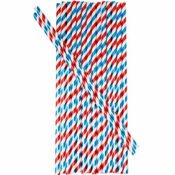 Sugerør i papir med striper i rødt, hvitt og blått. 24 Stk.