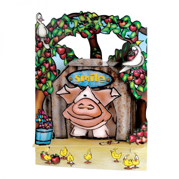Swingcard med gris: 3D-formet kort som består av en rekke bevegelige deler, og som gjør at gjenstandene i senteret kan svinge frem og tilbake.