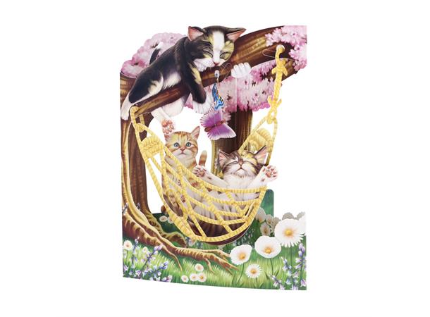 Swingcard med katter: 3D-formet kort som består av en rekke bevegelige deler, og som gjør at gjenstandene i senteret kan svinge frem og tilbake.