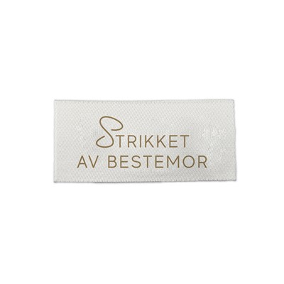 Symerke med tekst/motiv i tynn, vevd kvalitet. Kan vaskes på 40 grader. Strikket av bestemor. »