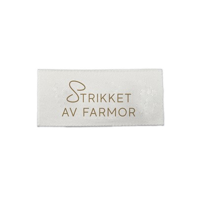 Symerke med tekst/motiv i tynn, vevd kvalitet. Kan vaskes på 40 grader. Strikket av farmor. »