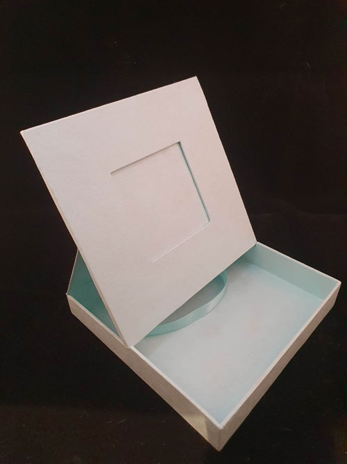 gaveeske med plass til bilde. Lokket settes opp som et staffeli.