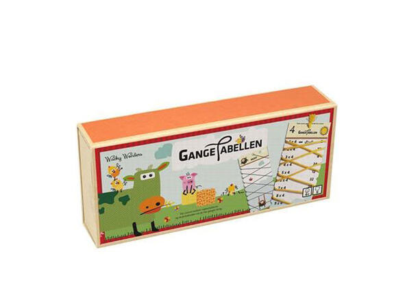 Dette læringsspillet gjør gangetabellen til en lek. Trekk snoren mellom regnstykkene og se på baksiden om du har ganget riktig. Esken inneholder kort med gangetabellene fra 2-10.