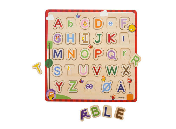 Lær alfabetet med dette trepuslespillet i fine farger. Hver bokstav fra A-Å skal plasseres på rett sted. Under de store bokstavene skjuler det seg tilsvarende små bokstaver. Styrk barnets bokstavlæring, fornemmelse for former, fargegjenkjennelse og hånd-øye koordinasjon. Fra 4 år.