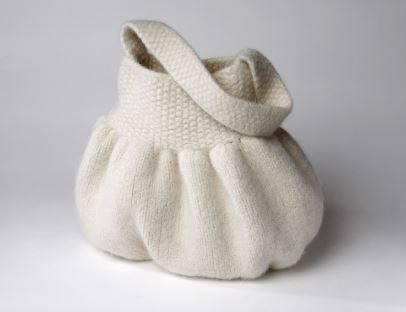 Tasken strikkes i glatstrik og med en bred kant i perlestrik i Wool4you garn nr. 4.